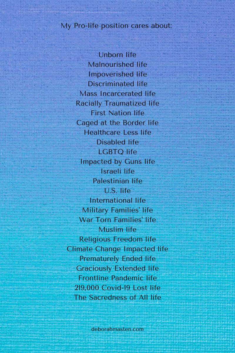 Love this! It is one of my biggest frustrations with most of my “pro-life” friends. It is very limited—often just to unborn fetuses. It often includes being pro-gun rights, anti-immigration, anti-SNAP and WIC (or at least wanting to limit it), pro death penalty, etc. It seems very hypocritical and unthinking.